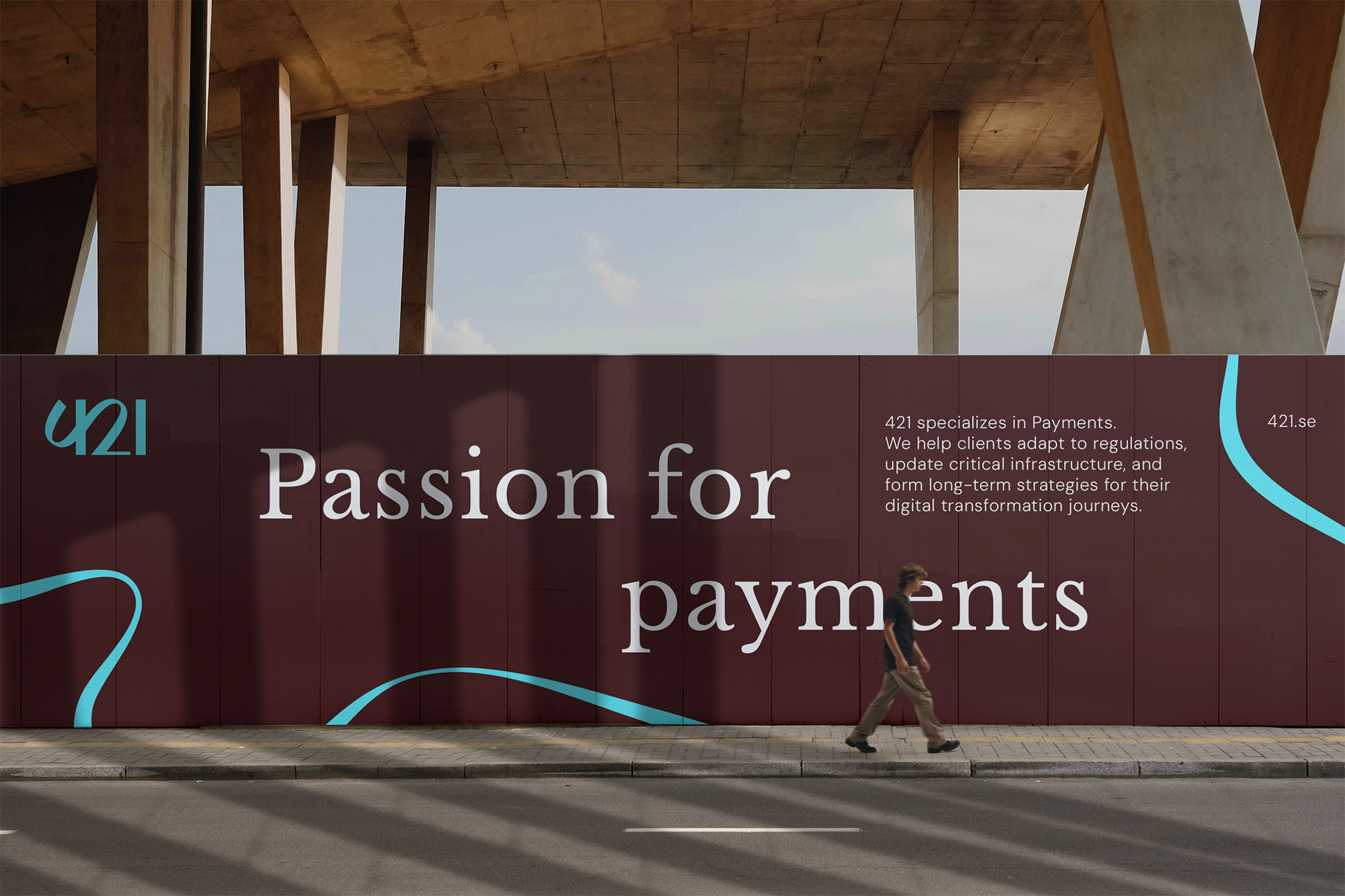 421s nya varumärke har en tydlig men flexibel profil, och ett uttryck i både text och bild som autentiskt och uppriktigt speglar de verkliga människorna som utgör företaget. Som en röd tråd genom varumärket går en slingrande stig, som symboliserar både det egna företagets resa, betalmarknadens föränderlighet, och den utveckling som 421 hjälper sina kunder igenom. I struktur, navigation och copy hjälper webbplatsen sina besökare smidigt och lättförståeligt från första frågetecken till första mötesförfrågan.