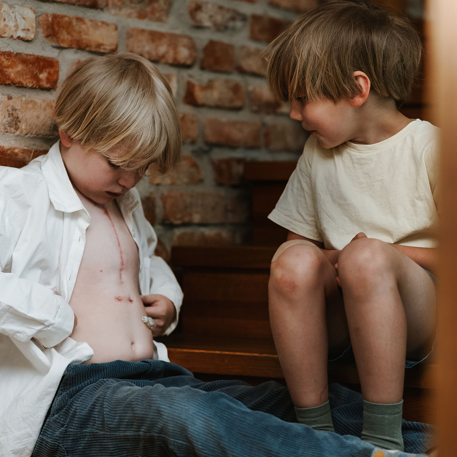 För att visa det så har vi fotograferat verkliga “hjärtebarn”, barn med medfödda hjärtfel, i olika situationer som på många sätt är en vanlig del av barndomen, men som också innehåller ovanliga men allvarliga inslag. Ett födelsedagskalas, en koja, eller några skrubbsår som ska jämföras – men också att födelsedagskalaset och kojan den här gången blev i operationssalen, eller att det enorma ärret från hjärtoperationen jämförs med de vanligare skrubbsåren.